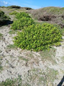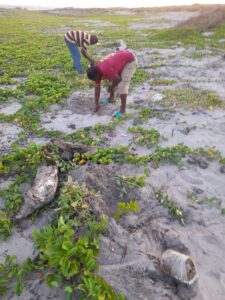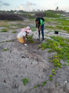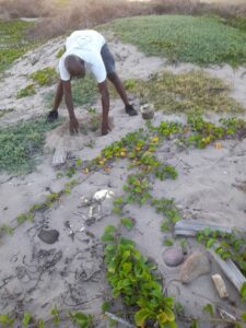 In 2022 the Nevis Turtle Group (NTG) received a micro-grant from the Caribbean Natural Resources Institute (CANARI) to carry out a coastal replanting project on Dog Bay beach at Indian Castle. This is a beach that has been heavily mined for sand at a steady rate up until the mid 1990’s and sporadically afterwards. Today, illegal sand mining continues to be a threat to the nesting sea turtle population. 100 saplings were planted at the location. These consisted of 80 buttonwood mangrove plants and 20 coco plum plants. The area is arid and some plants succumbed to the dry conditions. All the coco plums (icacos or fat pork) died. 30 of the buttonwood plants are still alive. A surge in nesting turtles during 2025 gives this project increased importance. However, renewed illegal sand mining in 2025 and 2026 is a clear and present threat to sea turtle conservation efforts here. Most of the buttonwood plants that are left have adapted well to the conditions and have already thrown out flowers and seeds. It is hoped that these plants will spread thus restoring the coastal ecosystem that was there before the unregulated and illegal sand mining. Groups included in the replanting efforts were the Indian Castle Fisher Folk Association and the Charlestown Secondary School Environmental Club.